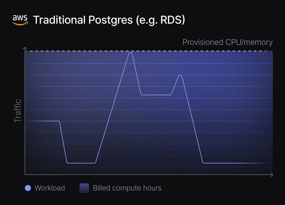 Variable load patterns are common, but traditional managed databases require provisioning a fixed amount of CPU and memory. To avoid degraded performance or even outages, it is standard practice to provision for peak traffic, which means paying for peak capacity 24/7 — even though it's needed only a fraction of the time.